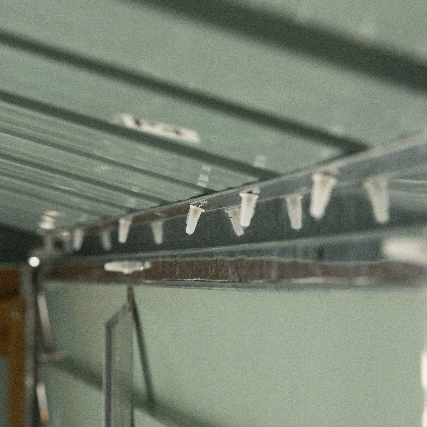 Dwa otwory wentylacyjne zapewniają dobrą cyrkulację powietrza. Szerokie przesuwne drzwi zapewniają łatwy dostęp do szopy.