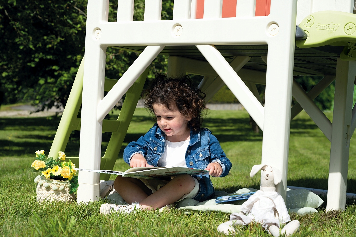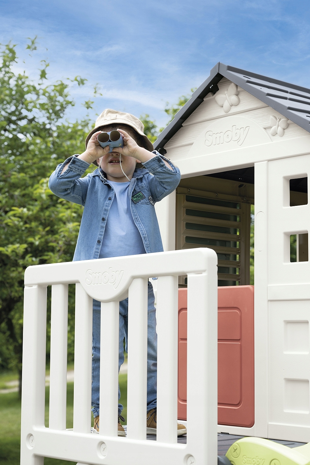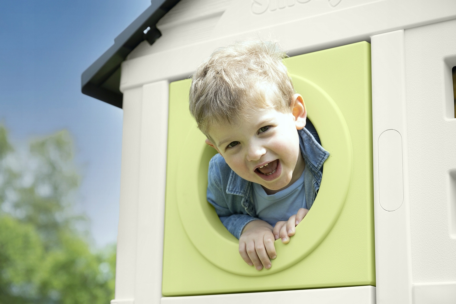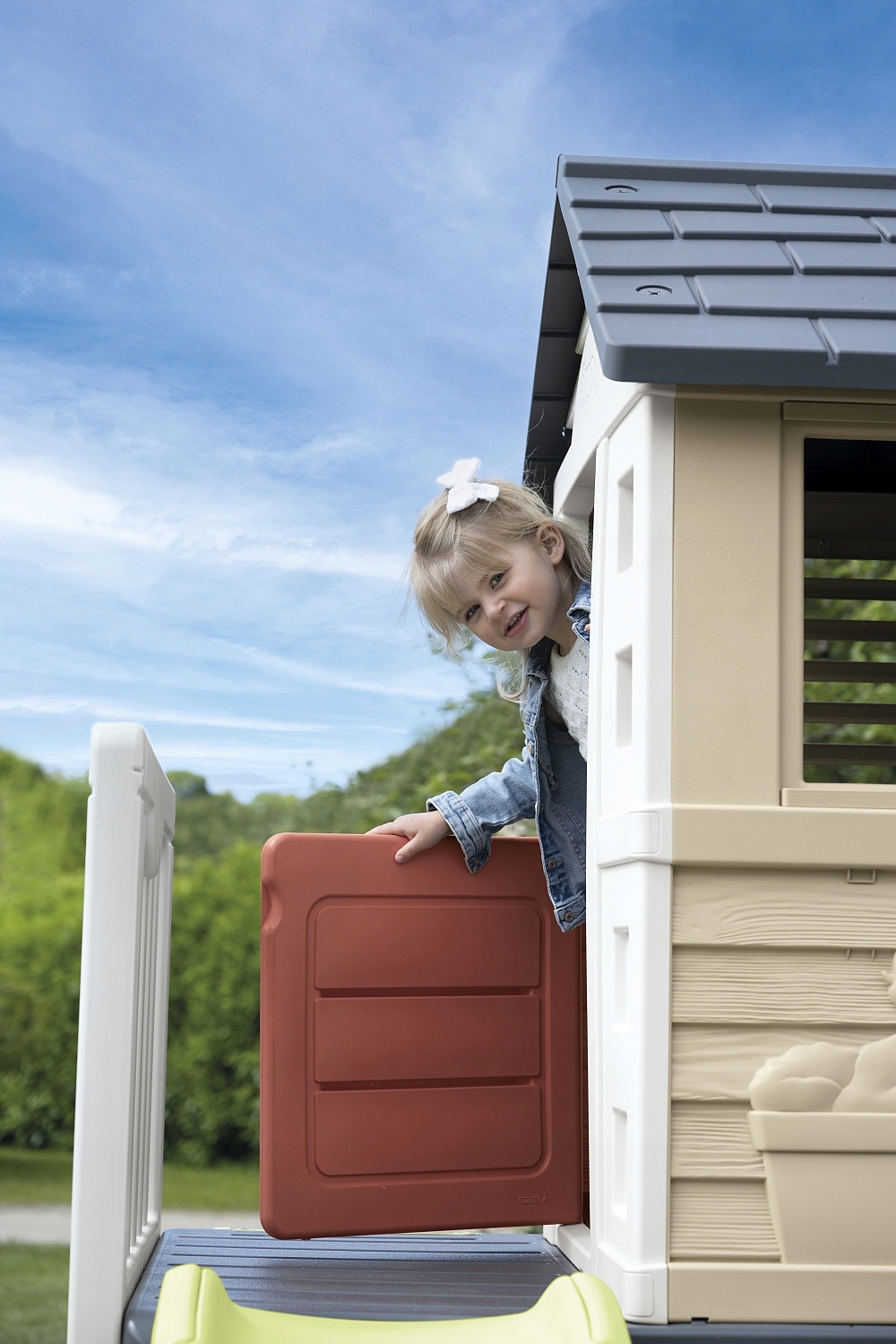 Tworzywo, z którego wykonano domek jest całkowicie odporne na działanie czynników atmosferycznych i pokryte powłoką anty UV zapewniającą trwałość kolorów i zapobiegającą ich blaknięciu na słońcu. To całkowicie bezpieczna zabawka, nadająca się do użytku tak na zewnątrz (ogród, działka itd.) jak i w domowym wnętrzu.