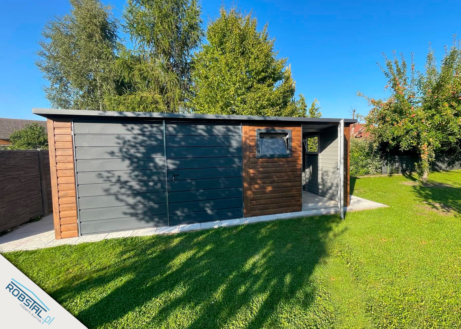 Ściany i brama garażu obite są blachą trapezową drewnopodobną w układzie poziomym w kolorze ciemny orzech. Brama garażowa oraz dodatkowe drzwi wykonane są z szerokich poziomych paneli, na dachu wzmocniona blacha o profilu T-14.