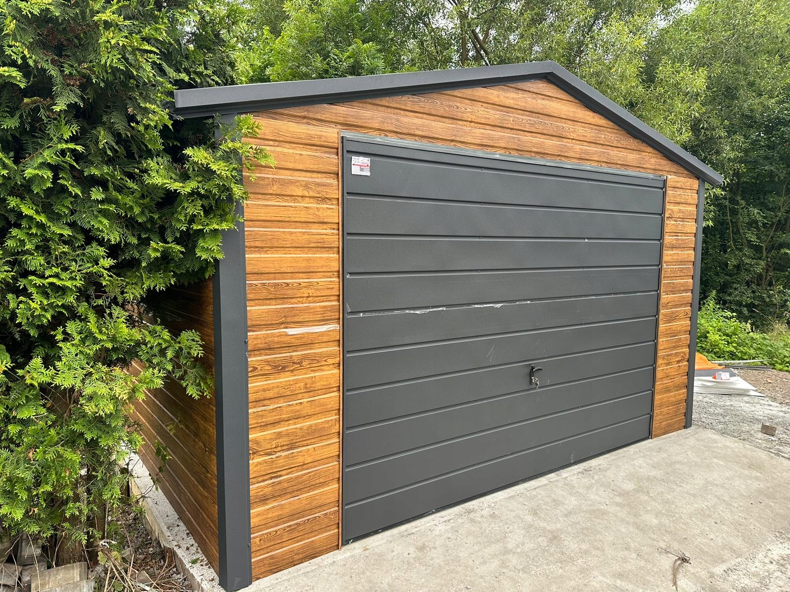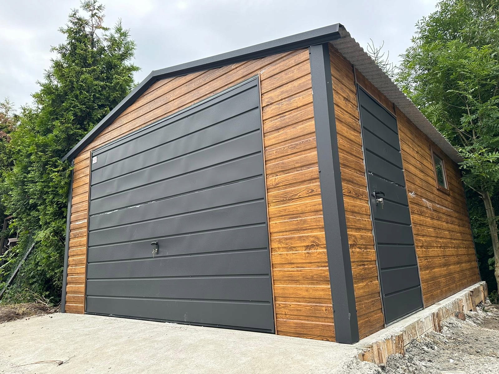 Garaż blaszany 4×6 drewnopodobny złoty dąb + grafit filc obróbki