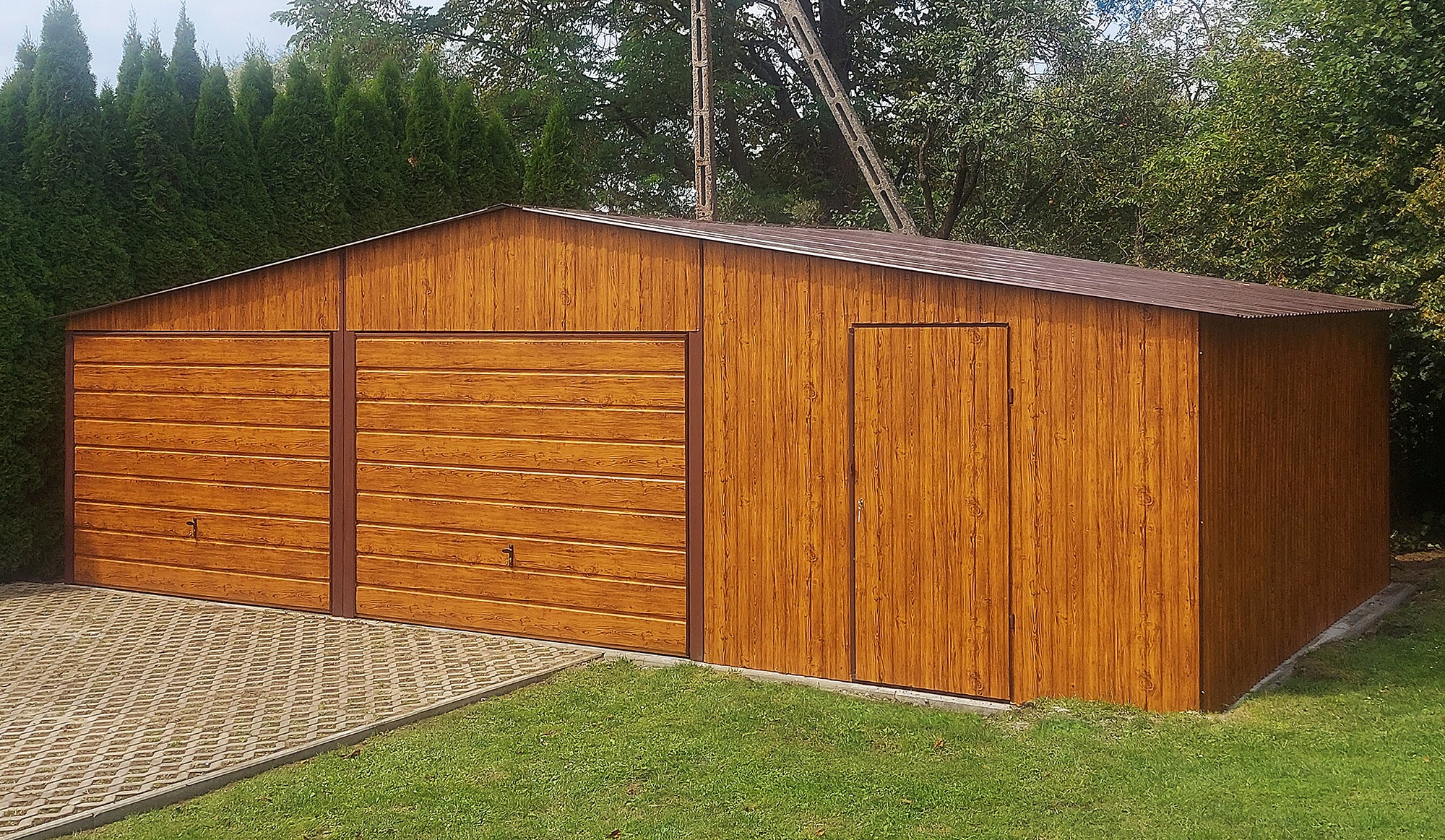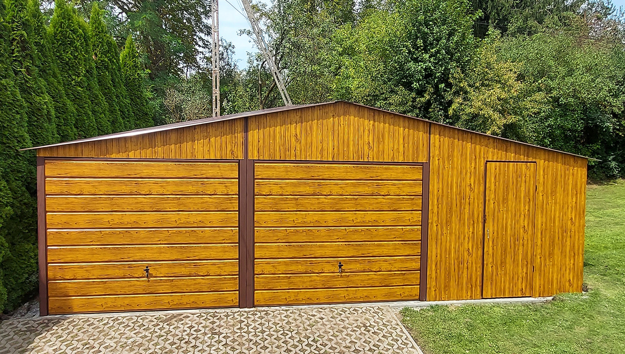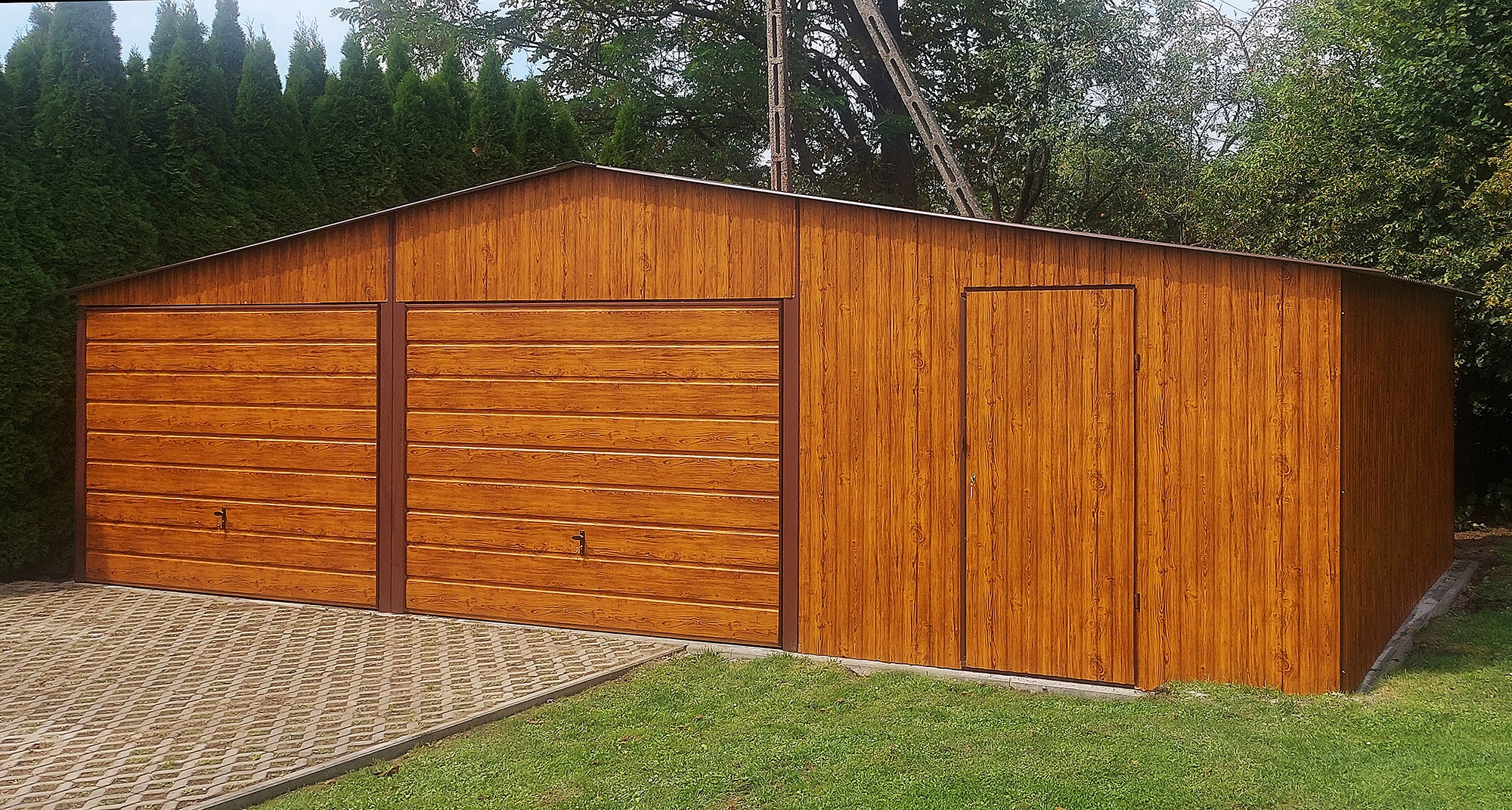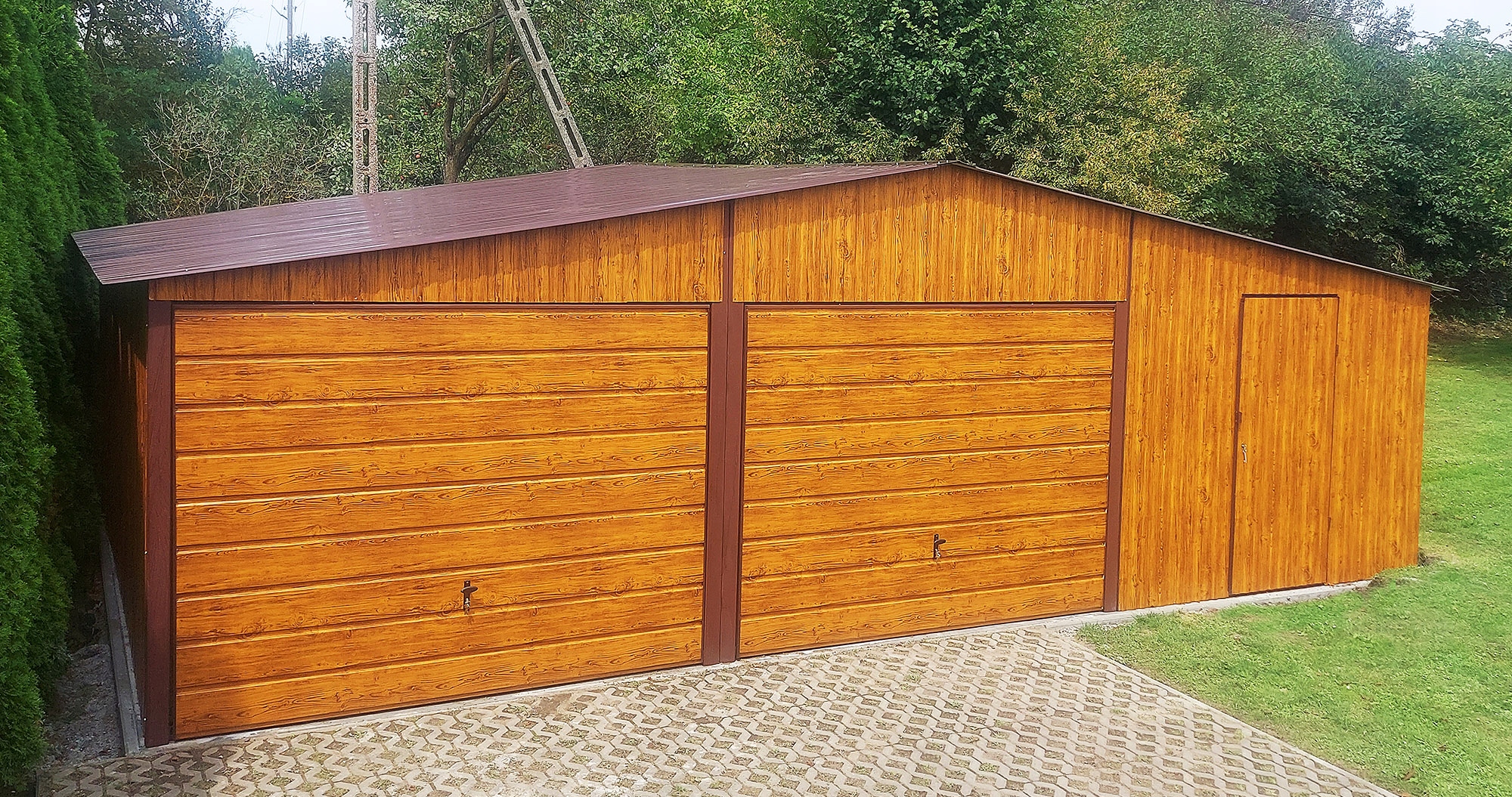 GARAŻ BLASZANY 9×5 DWUSPADOWY Imitacja drewna Złoty Dąb