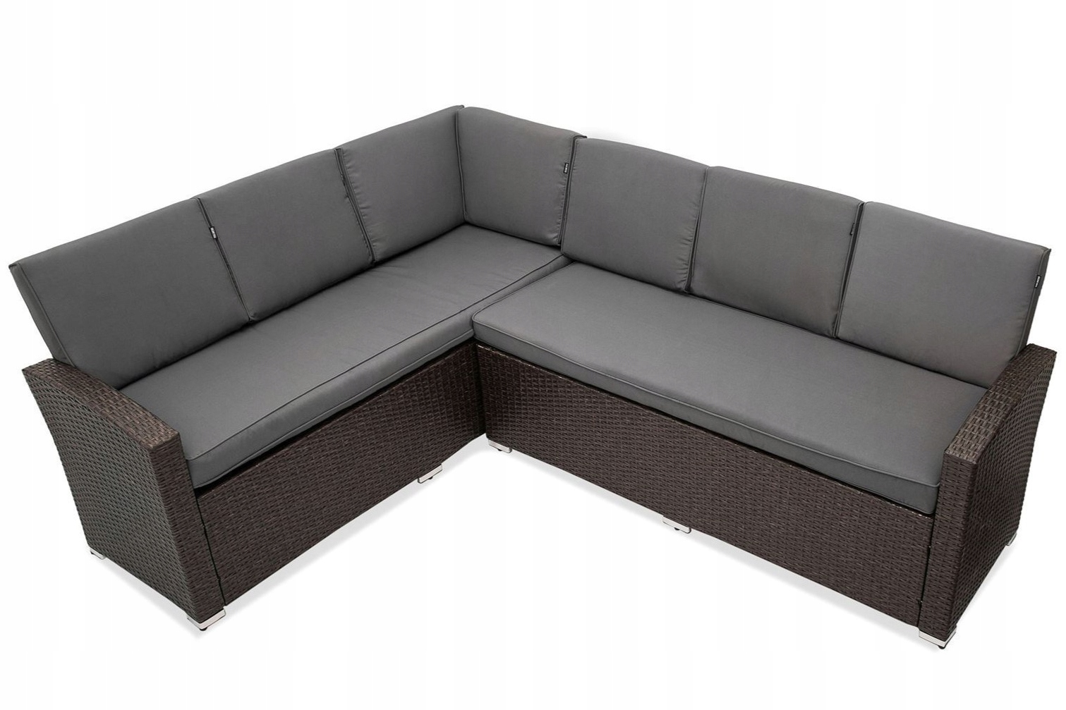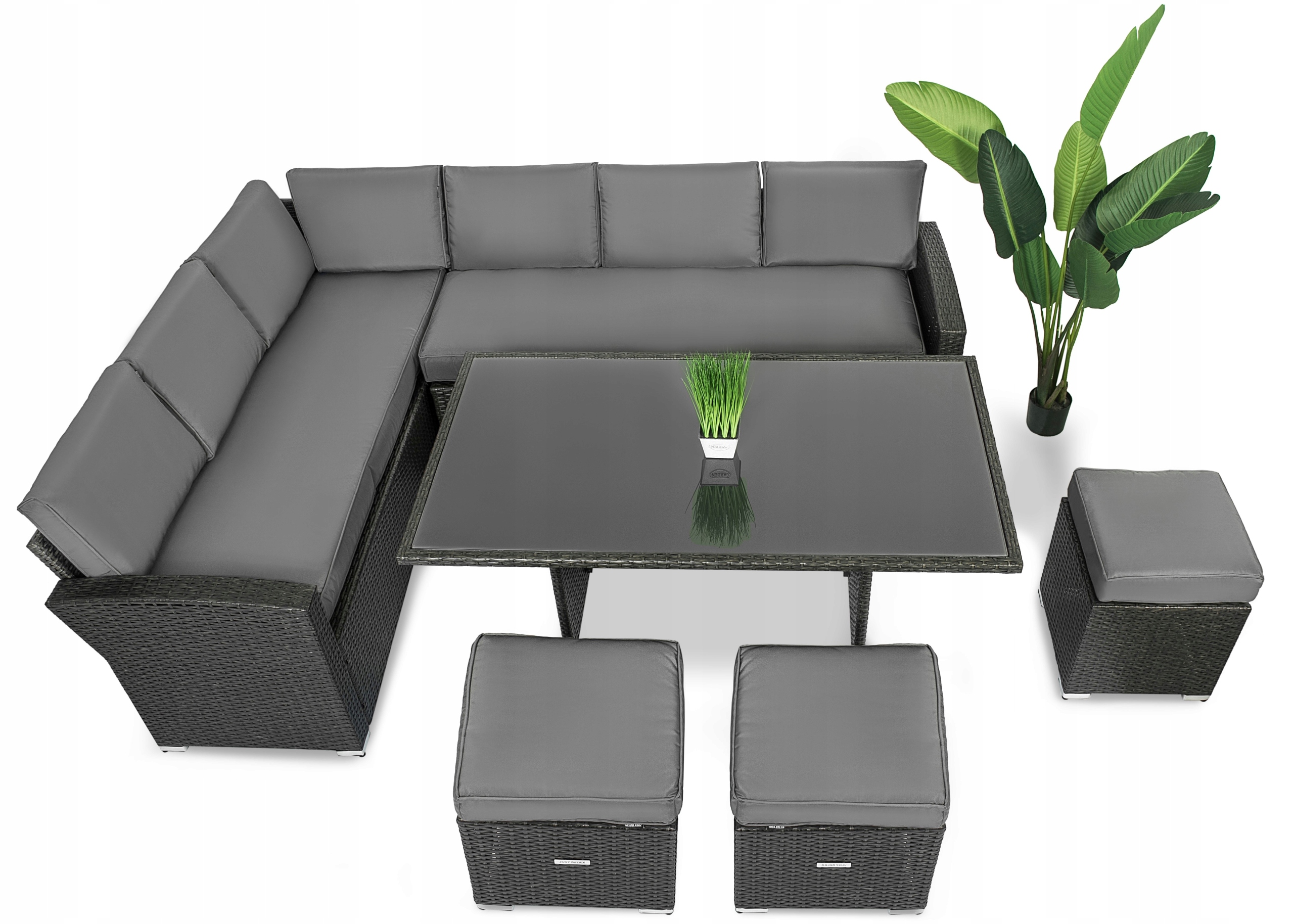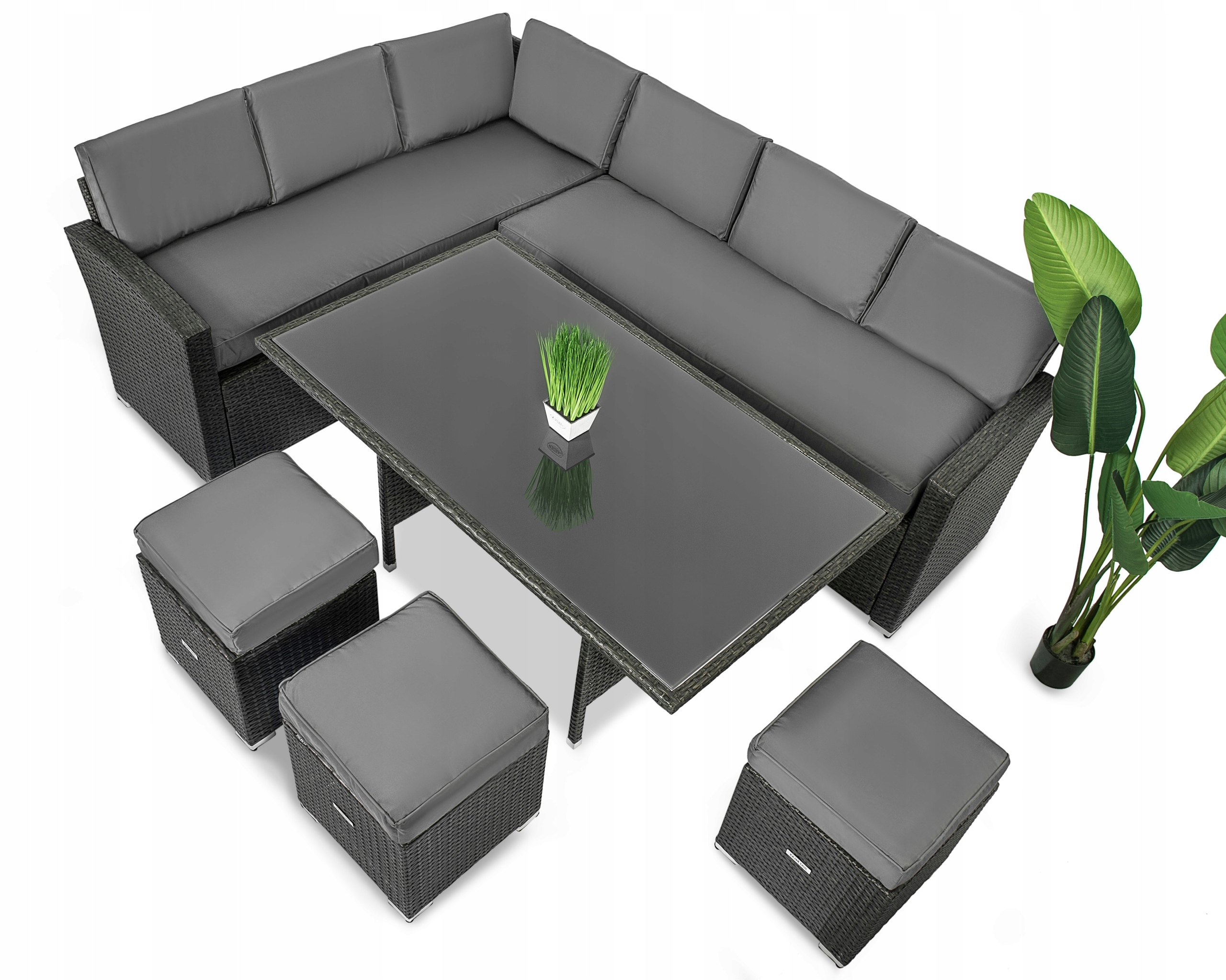 Zestaw składa się z 6 elementów: solidnego stołu, 2 sofy połączonych w narożnik i 3 pufów. Na siedziskach znajdują się poduszki o grubości 10 cm z wodoodpornymi, zdejmowanymi pokrowcami, które łatwo możesz ściągnąć do wyprania, a jednocześnie nie musisz martwić się o deszczową pogodę.