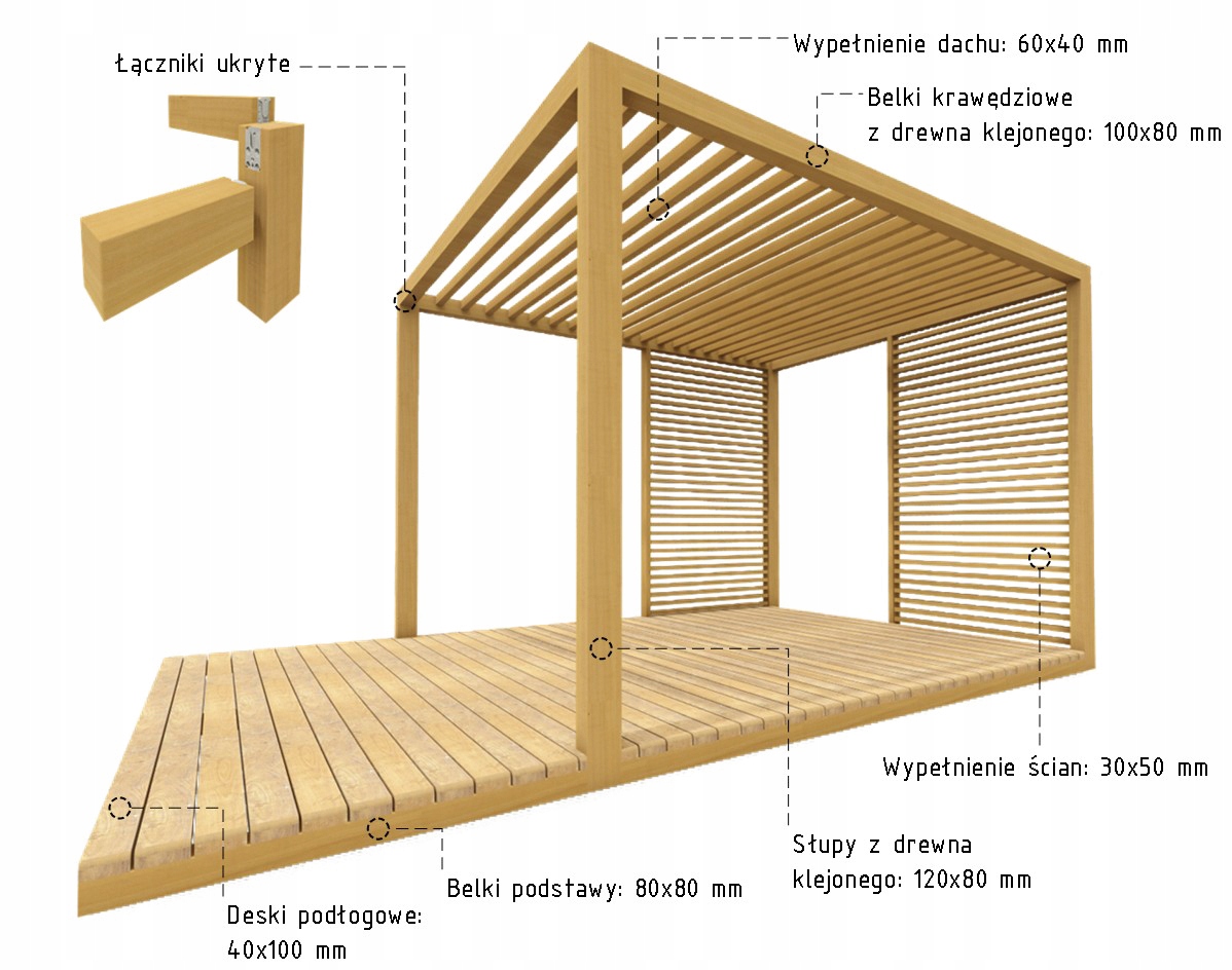 - Kompletny szkielet altany (dostajesz to co jest na grafice produktu)